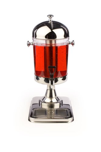 This stainless steel drink dispenser has a sleek appearance unlike any other. The countertop display holds 1.5 gallons of juice, tea, soda or punch in the plastic container. The stainless steel dome cover easily lifts off when it's time to add more liquids. Inside of the drink dispenser is a separate ice chamber used to keep beverages cold. Please note that this compartment is not meant for freezing; it is recommended to insert cubed or crushed ice within the chamber for best results. This stainless steel drink dispenser has a spring spigot for a self-serving setup. A drink tray is provided to prevent spillage and to keep counters clean. The stainless steel drink dispenser works well in both commercial and residential settings.