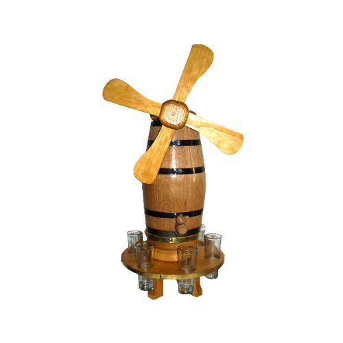 This unique spigot beverage dispenser is handcrafted from an authentic American White Oak barrel. With a windmill top and six shot glasses to fill, it's meant to be displayed on your bar. Beverage dispenser holds up to three liters of your favorite drink. Just fill it up and you're ready to go! Features: Handcrafted from an authentic American White Oak aging barrel. Made with 6 black steel bands. Medium toast. Interior of the barrel is charred, no artificial paraffin wax is used. Built-in storage for shot glasses. Makes a functional decoration piece. . Specs: Capacity: 3L. Dimensions: 7"W x 17"H x 7"D. Shipping: Ships within 7 to 10 business days. Includes: (6) Shot glasses.