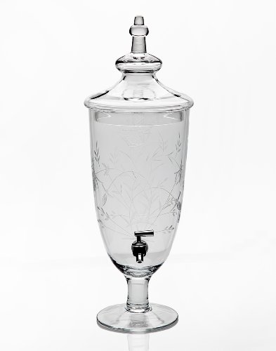 Quench your thirst and that of your guests, with this spectacular and attractive Savannah floral glass drink dispenser. Its fine design, and smooth finish will surely make a statement and at the same time avoid sticky situations. Holds 108 oz. Dimensions: overall: 13" H. from spout to table: 4", cover 3" H.