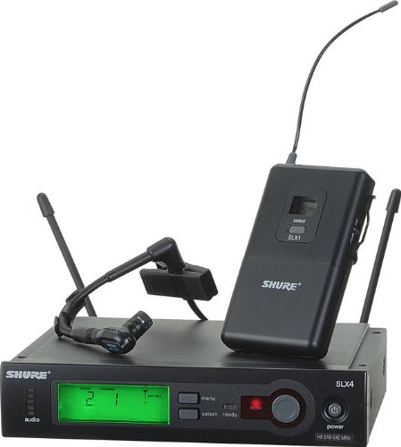 The Shure SLX14/BETA98H-G5 SLX Series wireless microphone systems provide the performance and reliability needed for use in venues, sound reinforcement, etc. The UHF system is available in up to 8 different bands, over a 24 MHz spectrum. This system includes the SLX4 receiver, SLX1 body-pack transmitter and Beta 98 instrument microphone.The SLX4 receiver is rack or desktop mountable and features a diversity antenna design. The diversity design allows dual antennas to compete for the strongest possible reception. An XLR microphone level and 1/4" phone line level outputs are featured. A comprehensive LCD display provides frequency, group and channel information as well as transmitter battery status, audio level and more.The SLX1 transmitter is a UHF body pack transmitter. The transmitter is powered for up to 8 hours on 2 AA size batteries and features a 4-pin microphone input jack, accommodating any Shure microphone featuring a TA4 connection. The SLX1 features an infrared sensor, allowing the transmitter to remotely sync frequency settings with the receiver. An adjustable mic/0 dB/-10 dB switch allows input from guitars, instruments and microphones.The Beta 98 is a cardioid, mini-condenser instrumental microphone designed to clearly capture the sounds of today's professional horn players. The pickup pattern of the Beta 98 provides high gain-before-feedback and excellent rejection of unwanted noise. With a high maximum sound pressure level (SPL), the Bet