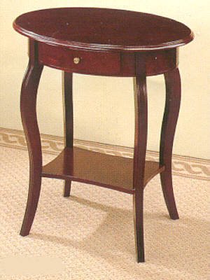 Phone Stands. Oval, wooden top cherry finish accent phone table with solid and veneer storage drawer, curved legs and base rectangular shelf with matching curved side. Dimension: 24"L X 17 1/2"W X 26"H